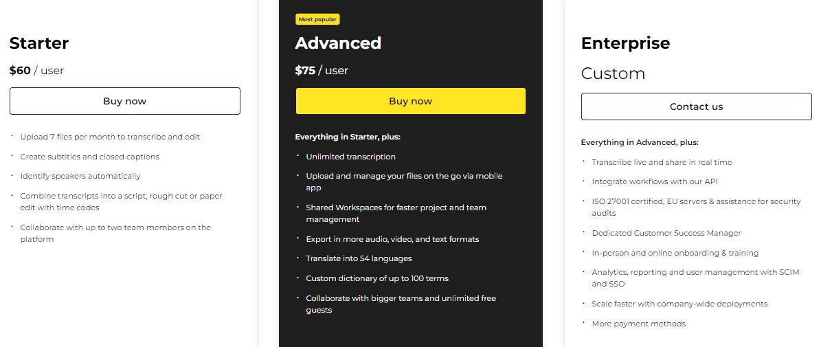 Advanced ($75/user/month) allows for unlimited transcriptions, more export options, and translation into 54 languages. Enterprise (custom)supports for live transcriptions and comes with a dedicated customer success manager.